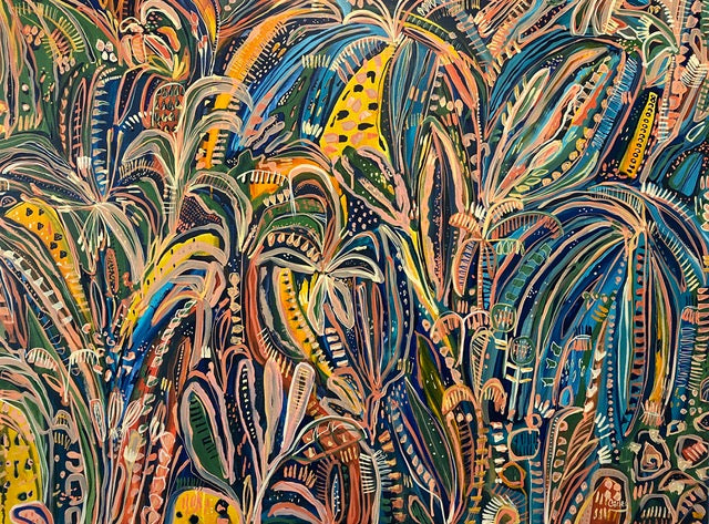 The original artwork is an abundant tropical landscape at night. It has an element of fun with a mixed palette to create the Tropicana feel and vibe. Abstract forms and details create this contemporary impression.