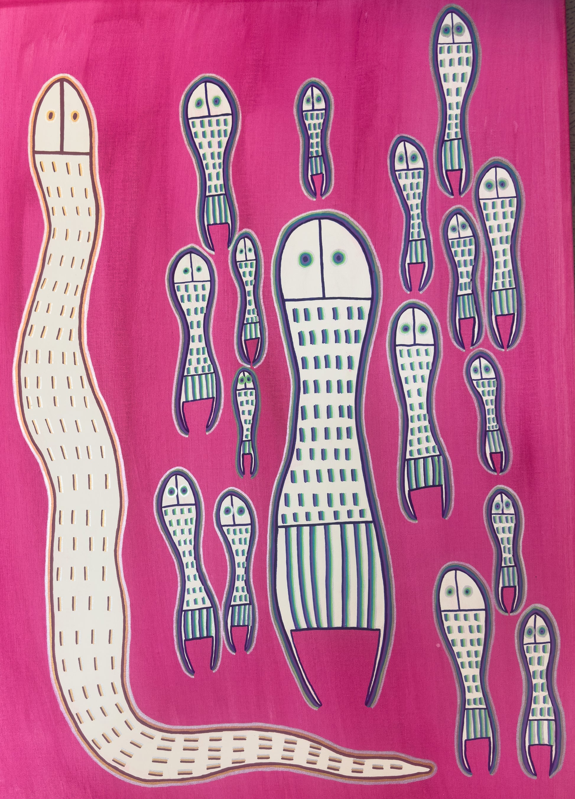 The Unguds represent the dreaming of the people which the Wandjina has given. The Wandjina is highly respected by the people because it gave the law, culture and language. The Ungud is given before birth to the parents, grandparents aunts or uncles of a child, through dreams, or it may come as a living animal. This is considered as a gift from the Wandjina to the parent, the animal becomes a gift to the unborn child which the child belongs to. When the child dies it goes back to being that animal. Today every individual has their own animal that belongs to them.