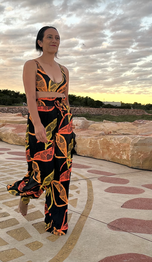 Unveiled on the runway at Country to Couture 2025, these prints celebrate Mowanjum heritage on a national stage. In vibrant patterns and bold designs, the collection brings their culture to life, each piece echoing the land, animals, and traditions that hold their stories.