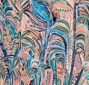 L’œuvre originale est un paysage tropical abondant la nuit. Il contient un élément amusant avec une palette mixte pour créer l’ambiance et l’ambiance Tropicana. Les formes et les détails abstraits créent cette impression contemporaine.