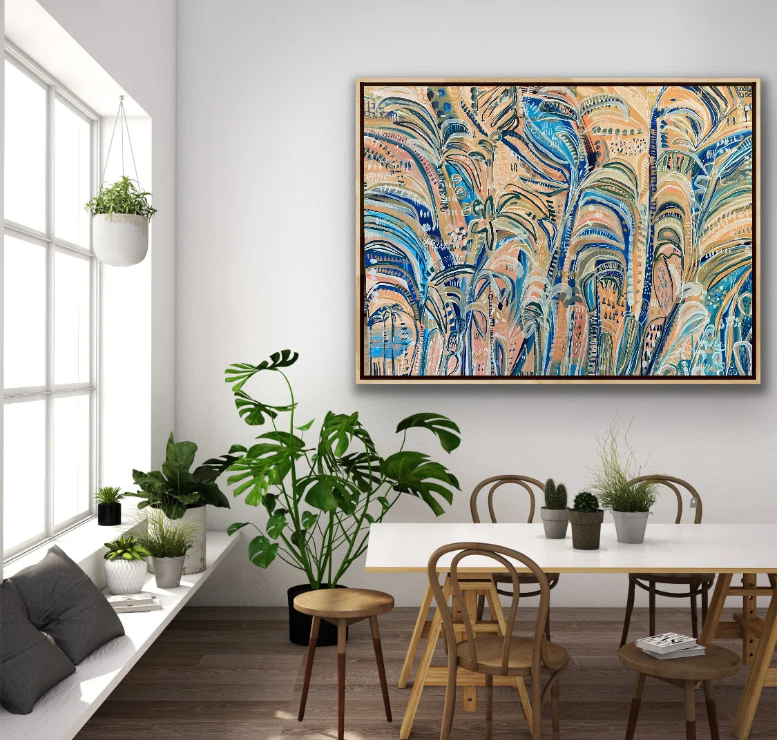 This modern abstract impression evokes a beach or poolside vibe with exotic plants and palm trees. Think of the Sun, Sea, Sand, and pools surrounded by a garden oasis.